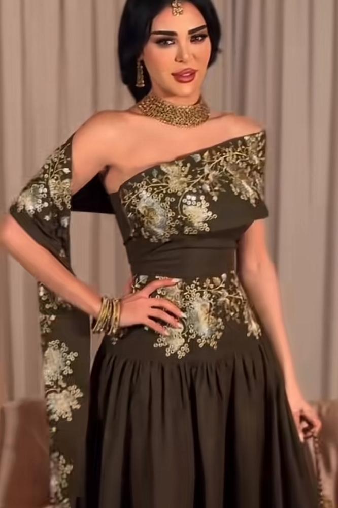 فستان أنيق من قماش داكن اللون مزين بتطريزات ذهبية وفضية على شكل زهور وأوراق. يتميز الفستان بقصة كتف واحدة مع شال متصل يمتد من الكتف إلى الأسفل. الجزء ...